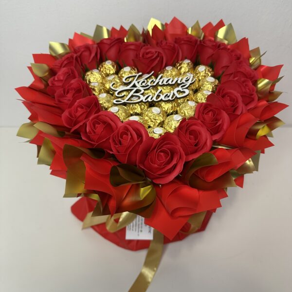 Bukiet w kształcie serca, średnica 28 cm, wysokość 30-35 cm. Zawiera praliny Raffaello i róże mydłane w kolorze czerwonym po całej krawędzi bukietu