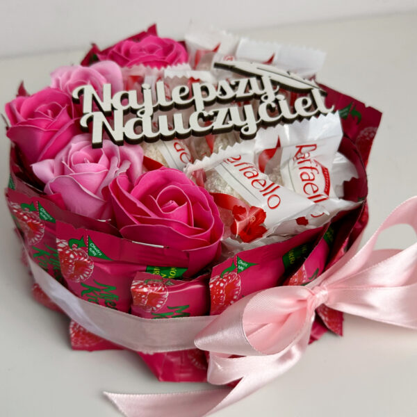 Ekskluzywny zestaw prezentowy pełny pysznych popularnych słodyczy takich jak Rafaello i Ferrero, ozdobiony piękną wstążką oraz napisem drewnianym ” Dla Babci i Dziadka”.